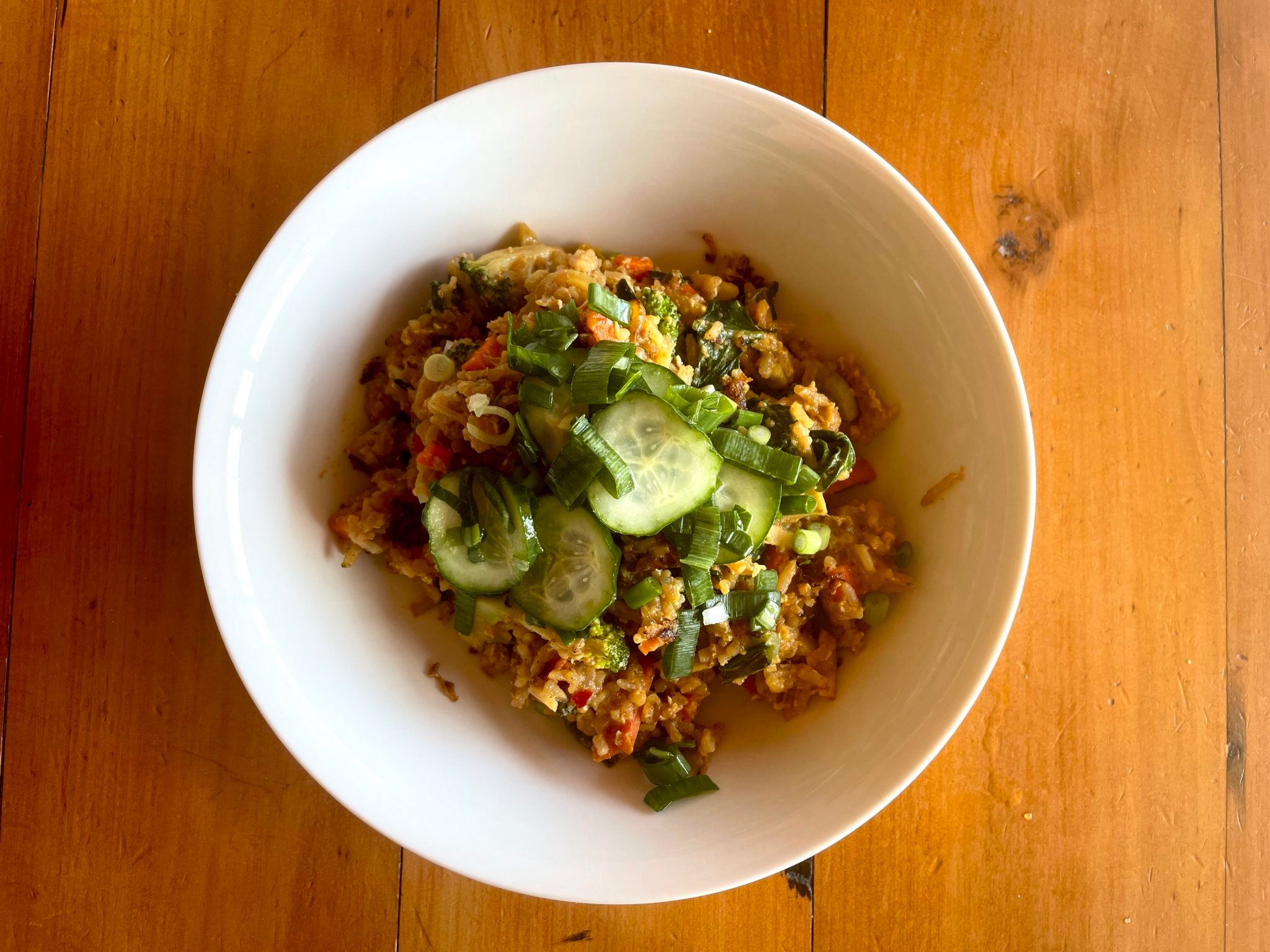 Remove the cover and give everything a gentle nudge (some delightful crispy bits will have formed on the bottom) and stir through the eggs. Divide between two and top with chopped spring onion and pickled cucumber. Sprinkle some pickle juice over for an extra vinegary/chilli hit.