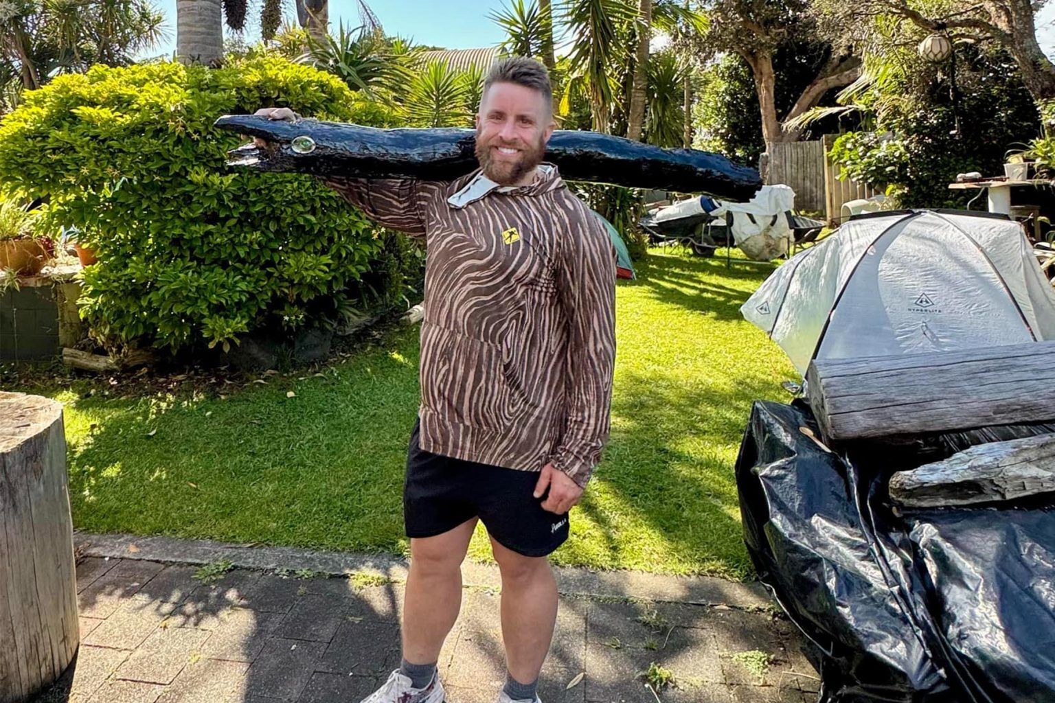 In November 2025 he set out from Cape Rēinga to complete Te Araroa. Biosecurity standards prevented Mahoney bringing his trusty Larry the Log to New Zealand, but a local trail angel has gifted him a new one. The piece of ancient kauri is estimated to be 2500 years old and has pāua shell inlay for eyes and kauri gum and pounamu in the mouth.