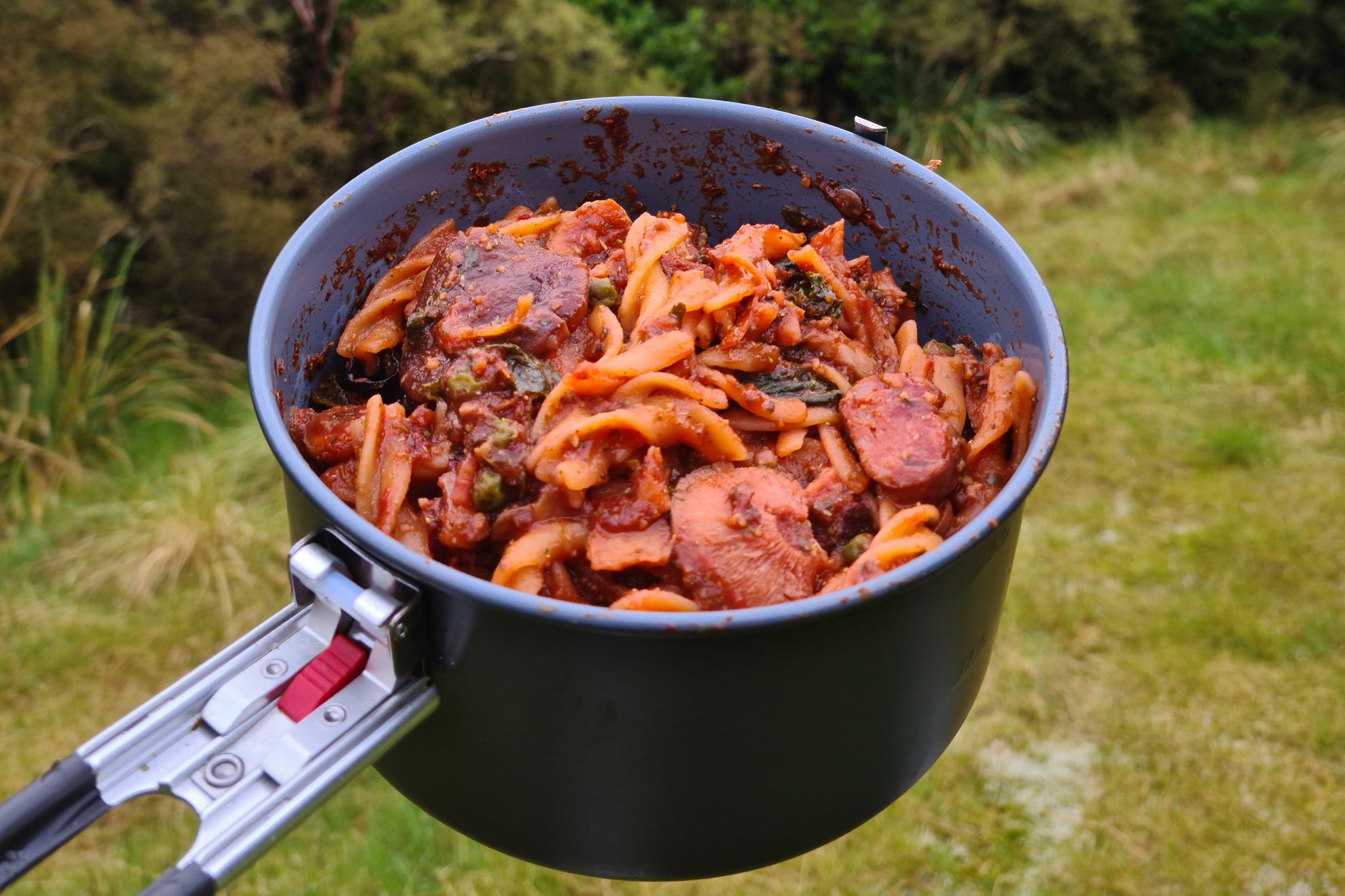 Heat the soaked dehydrated ingredients in the small billy or drinking mug until just before boiling, adding water as necessary. Once both the pasta and marinara are cooked, gently mix the sauce into the pasta.